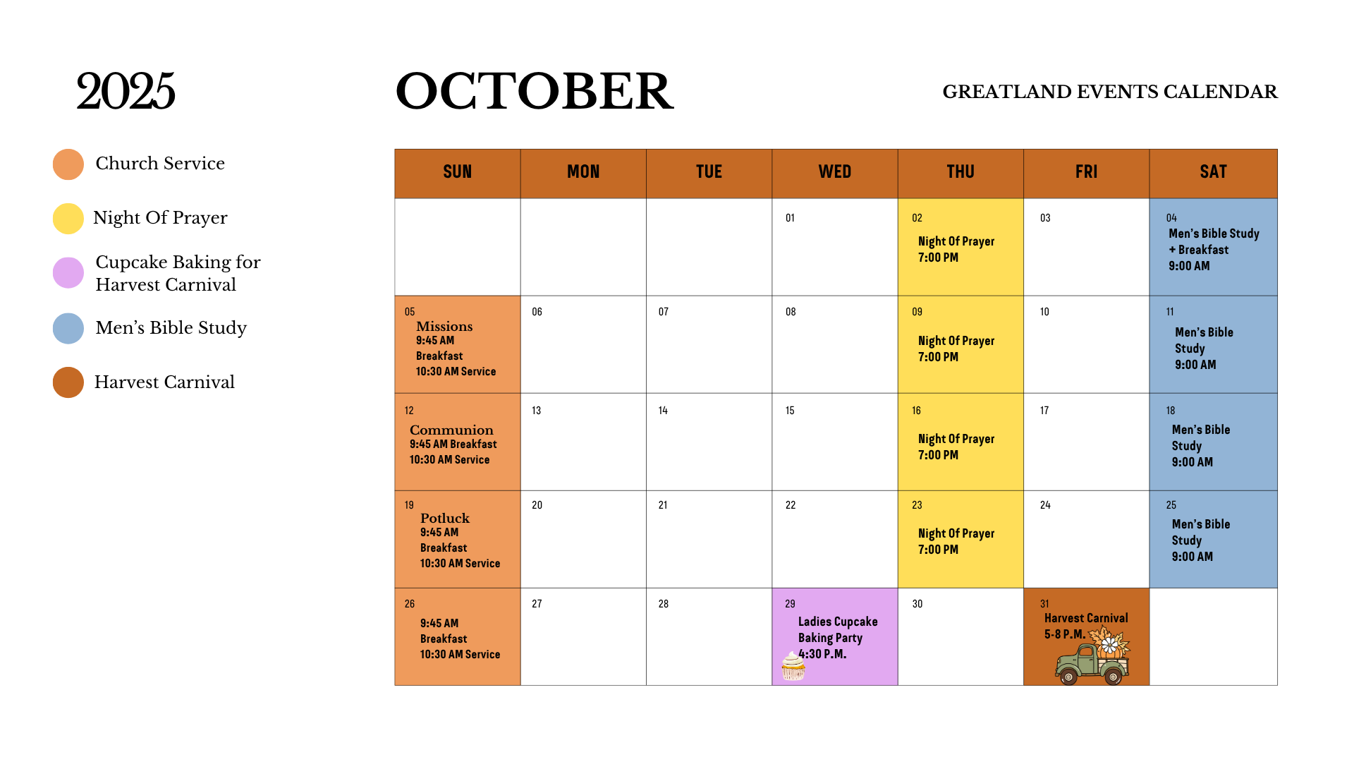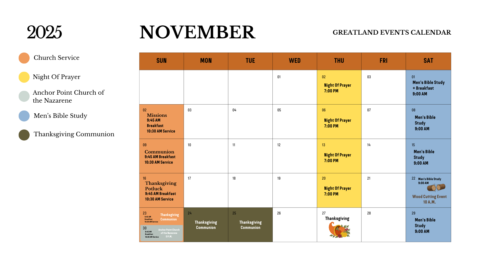 There’s always something happening at Greatland! From weekly gatherings and Bible studies to special events, retreats, and community outreaches, our calendar is a great way to stay connected. Check back often to see what’s coming up and find opportunities to grow in faith, build relationships, and be part of what God is doing in our church family.